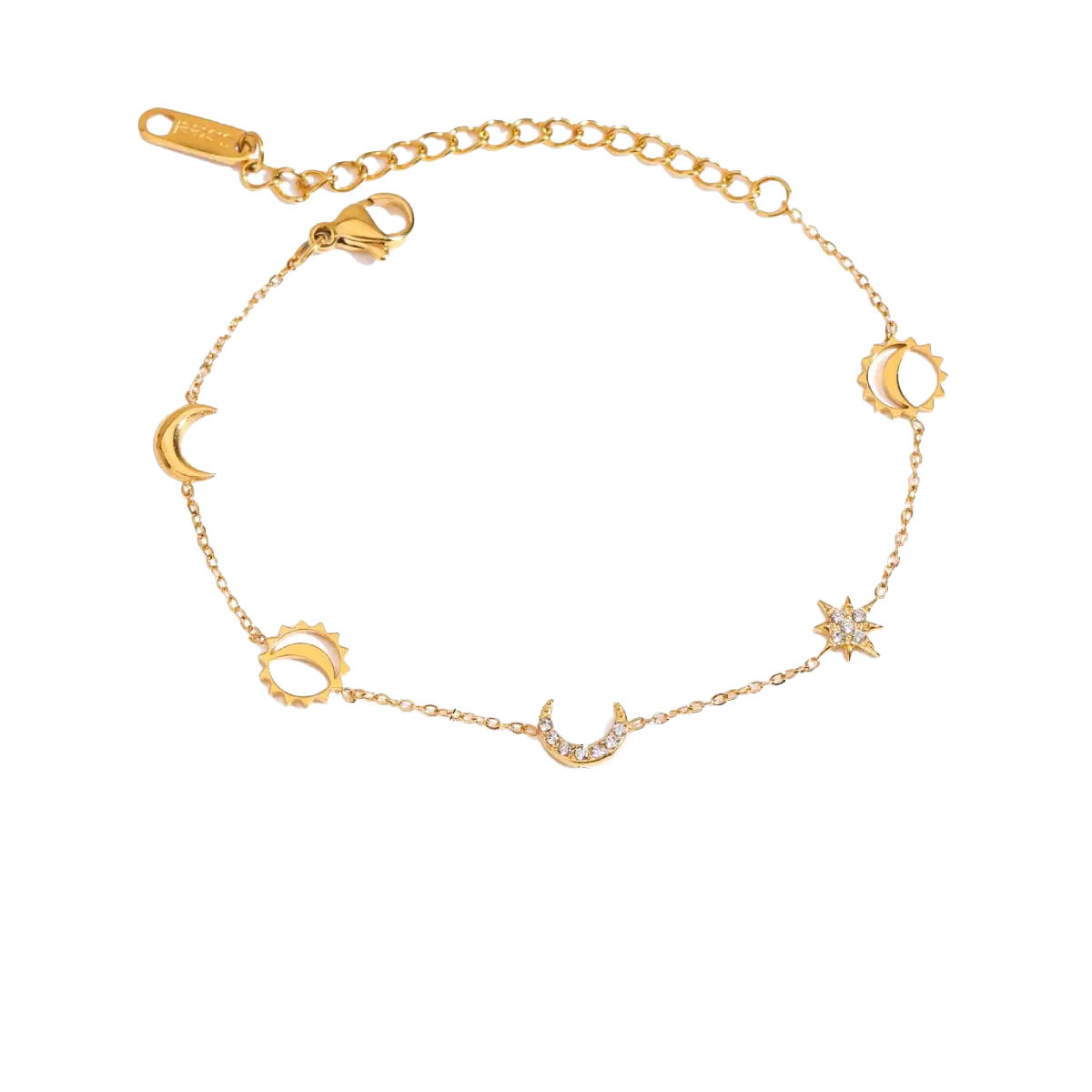Elevate your everyday elegance with the Star & Moon Charms Drop Bracelet. This refined piece features delicate celestial charms that add a subtle yet captivating shimmer to any outfit. Perfect for daily wear or as a thoughtful gift, it blends timeless design with modern sophistication, making it an essential addition to any jewelry collection.